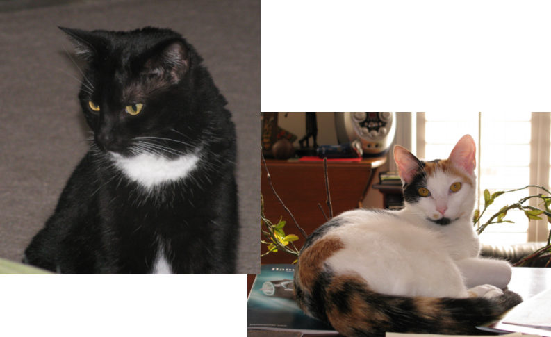 HOWEVER……in 2005 a cat came into our lives and then again in 2010 here came another one. The first one, a tuxedo cat, (Boo aka ” Big Cat”) was rescued out of a tree across the street from our house. She was a very small kitten and had a very loud mouth. The second one (Patches aka “Lil’ Bit”) was actually a calico kitten from a cat rescue called Heaven Can Wait. Just let me say, they keep us entertained. The older one is VERY bossy and the little one is like having a two-year old.